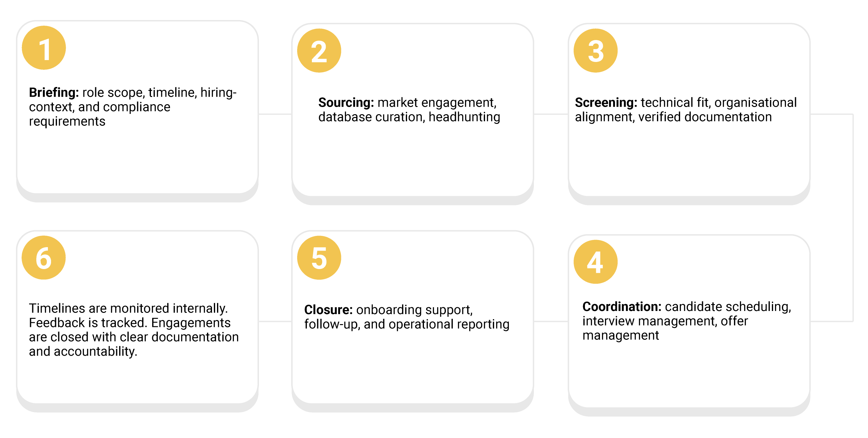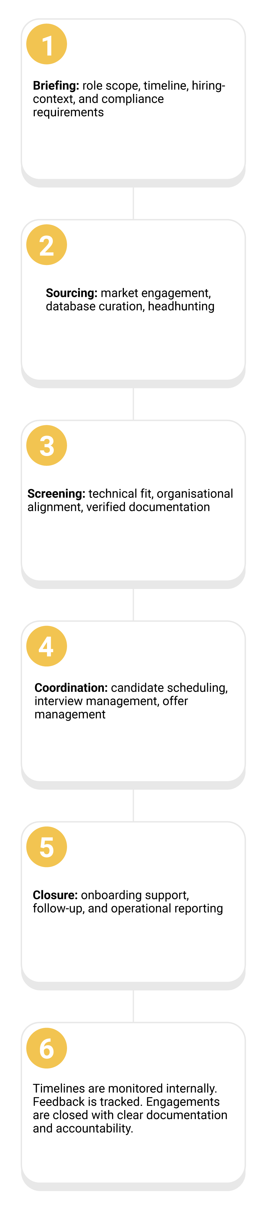 When a mandate is secured, the consultant who brings in the assignment remains the client’s point of contact from briefing to closure. They own the relationship and delivery accountability, ensuring continuity at every stage.